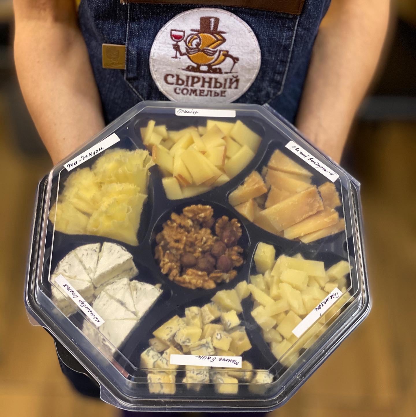 Сыры упакованы в плотную менажницу с крышкой, все сыры подписаны, а сама менажница перевязывается бантом