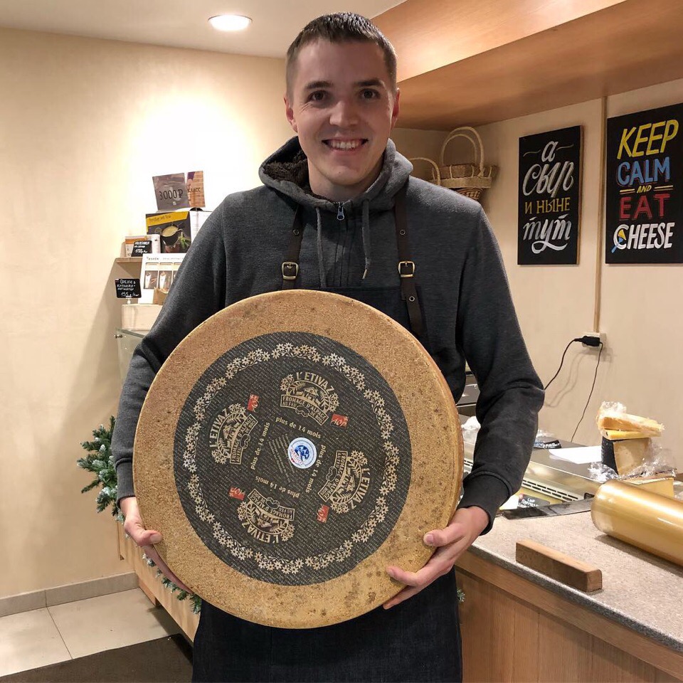 Вот такого 25-килограммового малыша нам привезли 😍 Как Вы думаете, что это за сыр ❓ Смотрите, как Александр режет эту аппетитную головку сыра Купить сыр