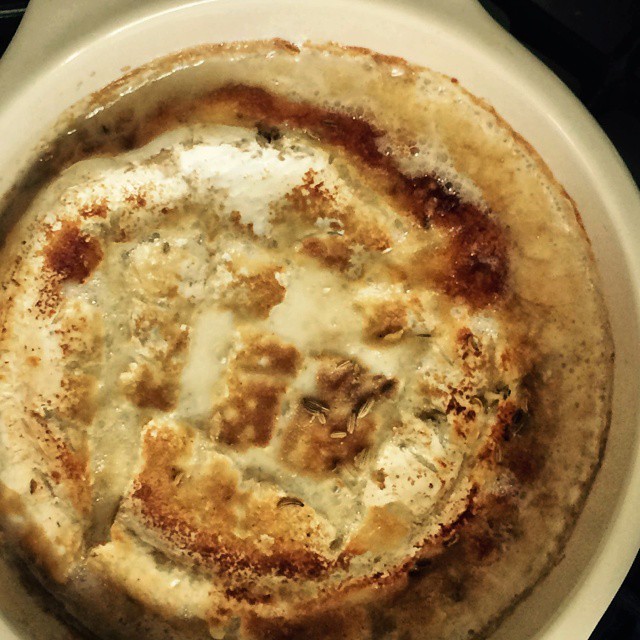 1. Делаем надрезы на верхний корочке Камамбера, добавляем немного специй по вкусу, например, чеснок или розмарин. Немного поливаем сверху белым вином.