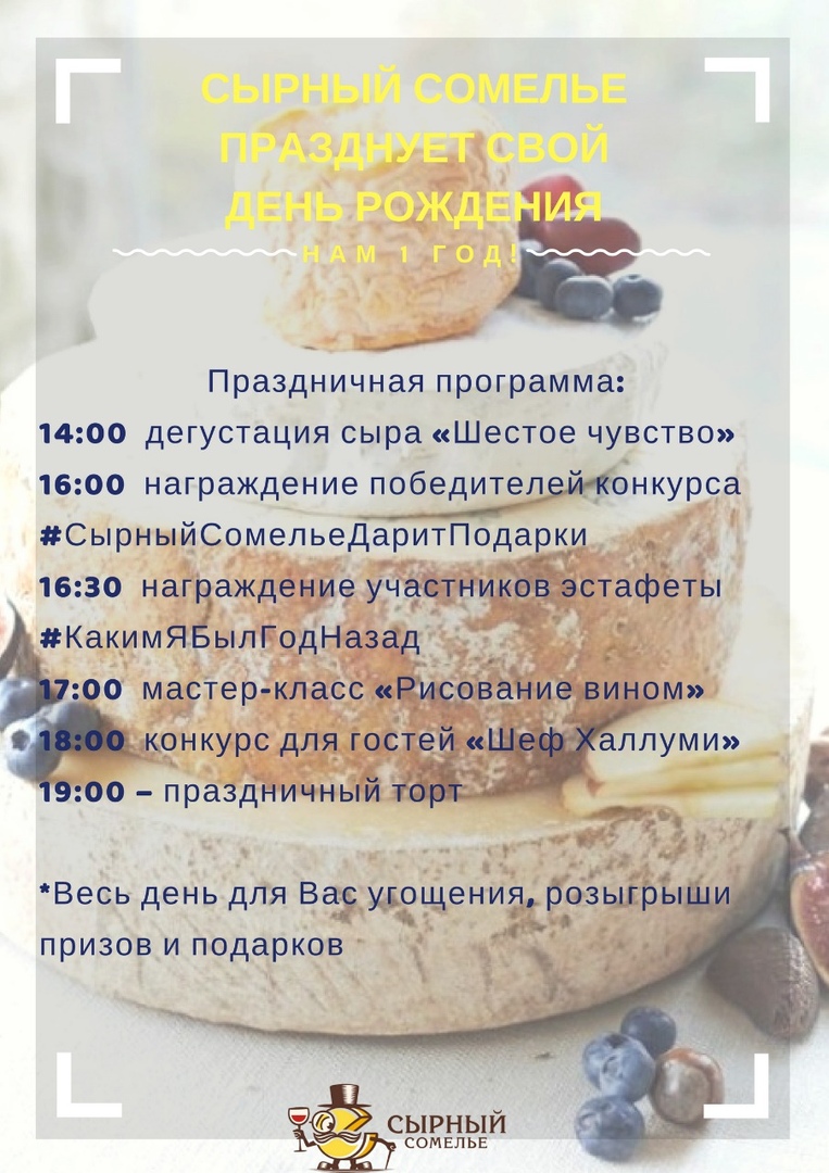 Мы будем рады видеть Вас на нашем празднике в качестве гостя и участника нашей программы! От нас конечно же сырные подарки и угощения!