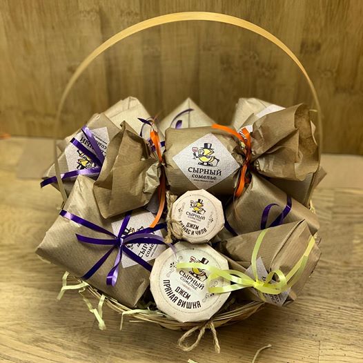 Помимо корзинок, сырный подарок может быть упакован в ящики, коробки и даже пакеты на спиле. Отличную пару сыру составит гастрономия: оливки, томаты, сырные конфеты, соусы, хамон, а также сырные аксессуары, например, специальный нож для сыра в виде символа года