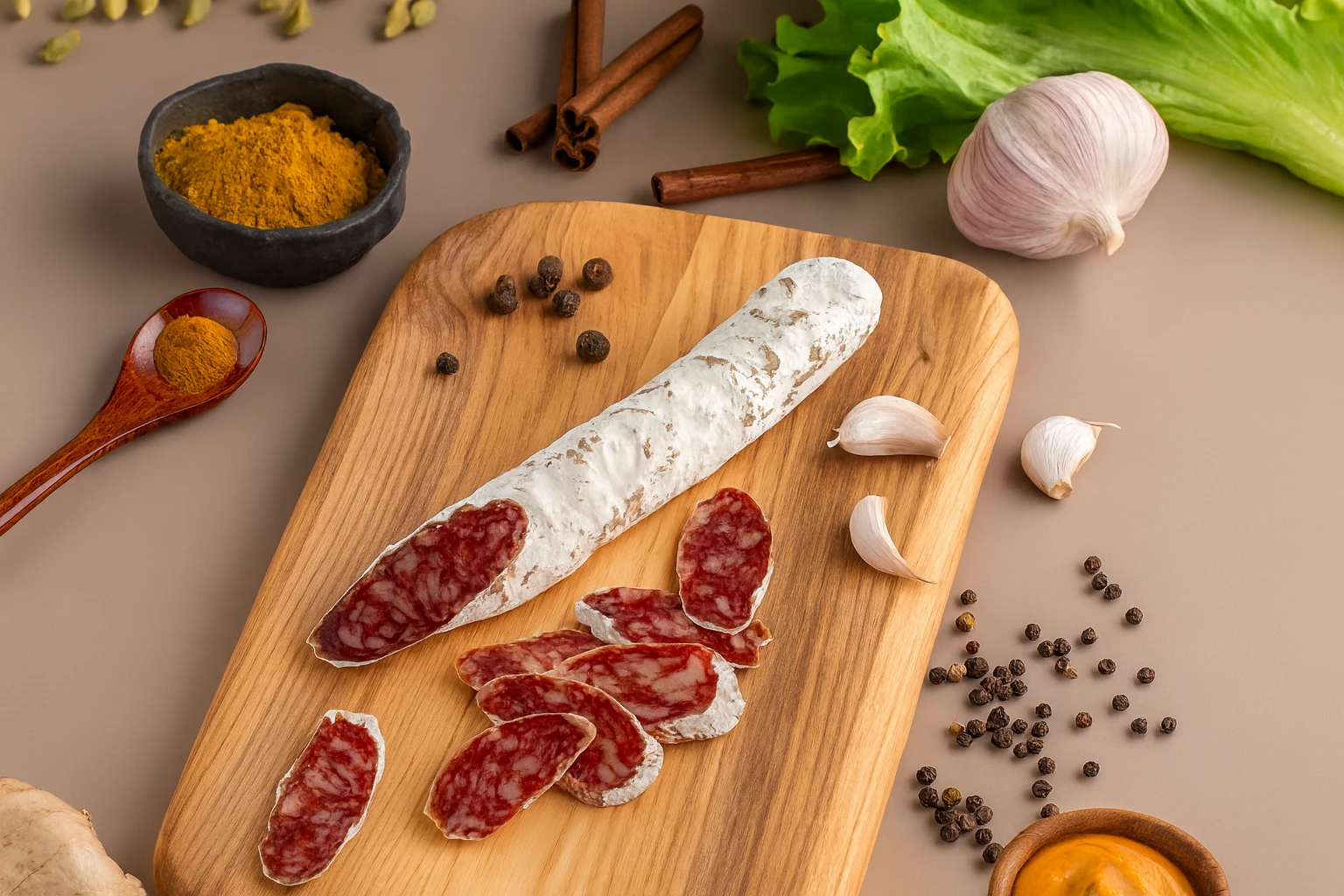 Эта колбаса — как билет в пряные уголки Индии. Благородная белая плесень подчёркивает насыщенный вкус, а тщательно подобранная смесь специй — паприка, кориандр, кардамон, тмин, куркума, красный перец и имбирь — создаёт согревающий, глубокий и многослойный аромат.