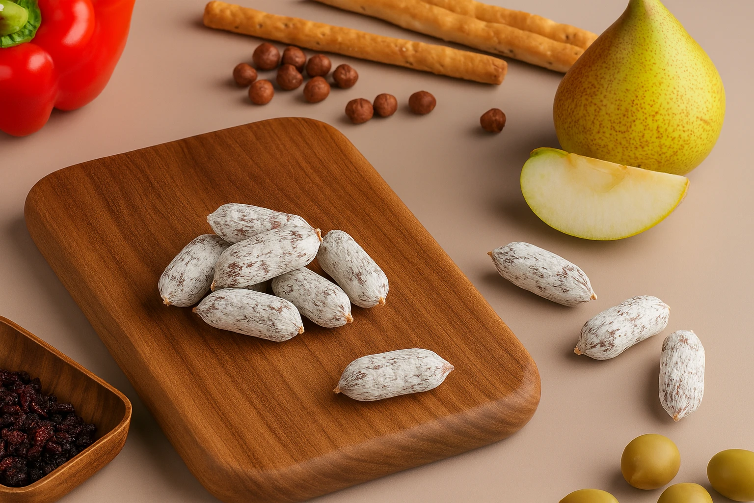 Сыровяленая колбаса с белой плесенью и карри — пряный деликатес с тёплым характером.