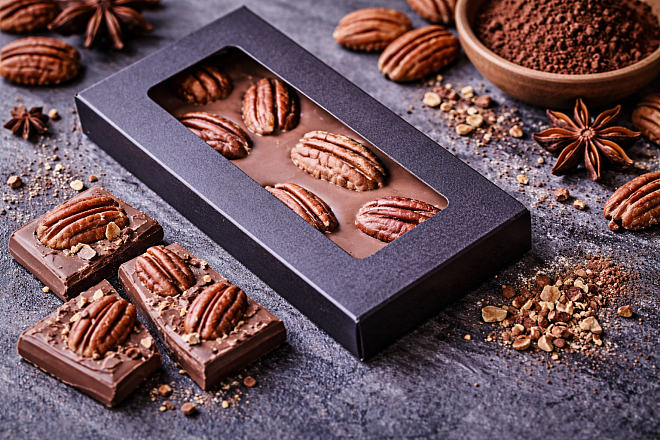 Молочный шоколад «Пекан и карамельные криспы» изготовлен вручную на основе бельгийского молочного шоколада с мягким сливочным вкусом.