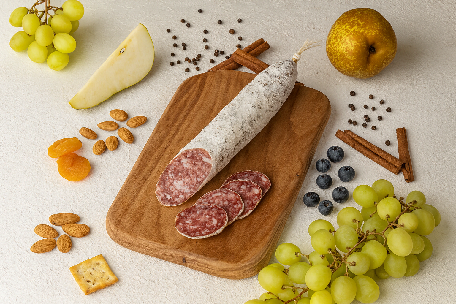 Сыровяленая колбаса с белой плесенью и карри — пряный деликатес с тёплым характером.
