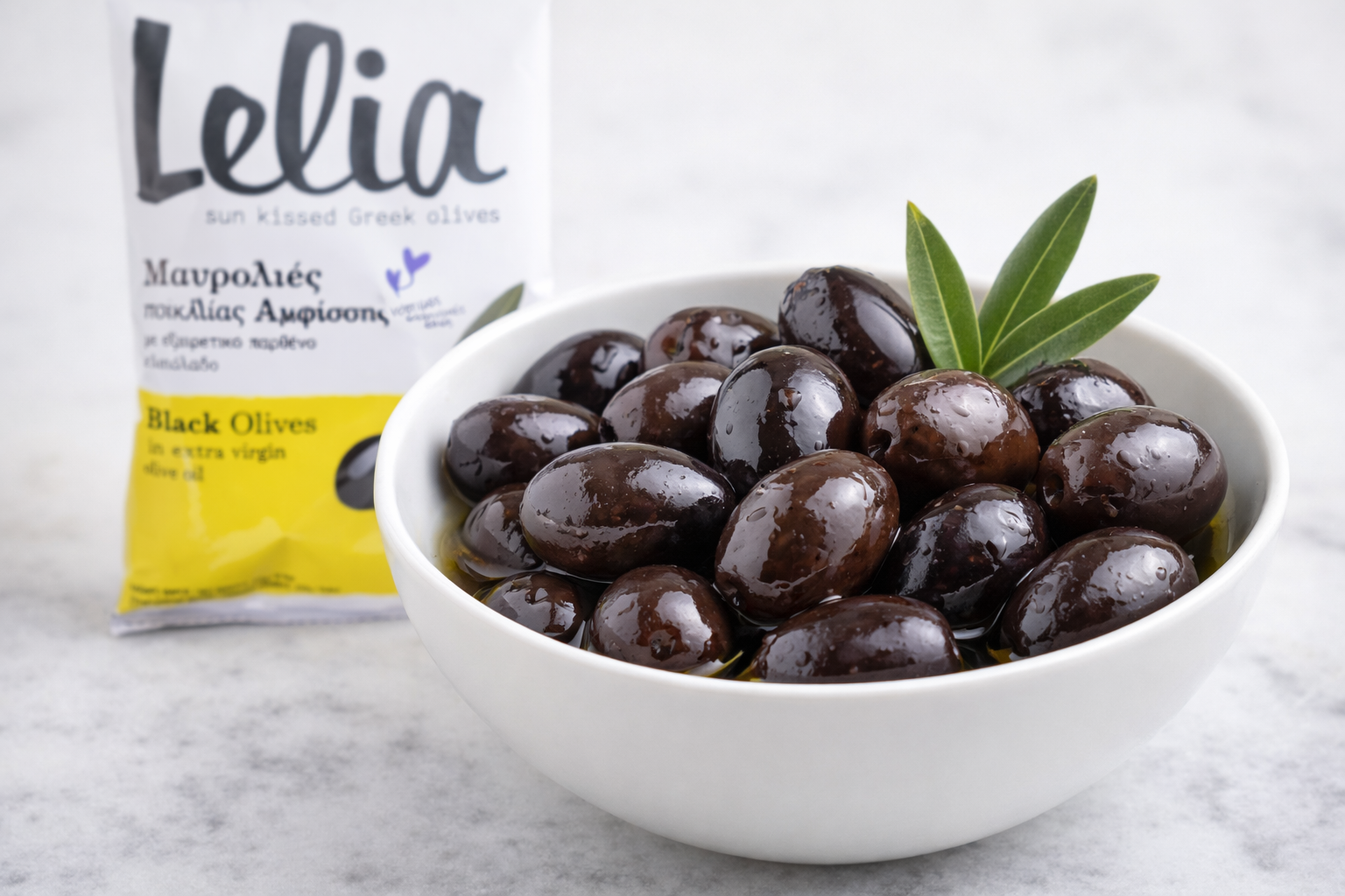Ассорти греческих оливок Каламата со специями в вакуумной упаковке.