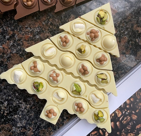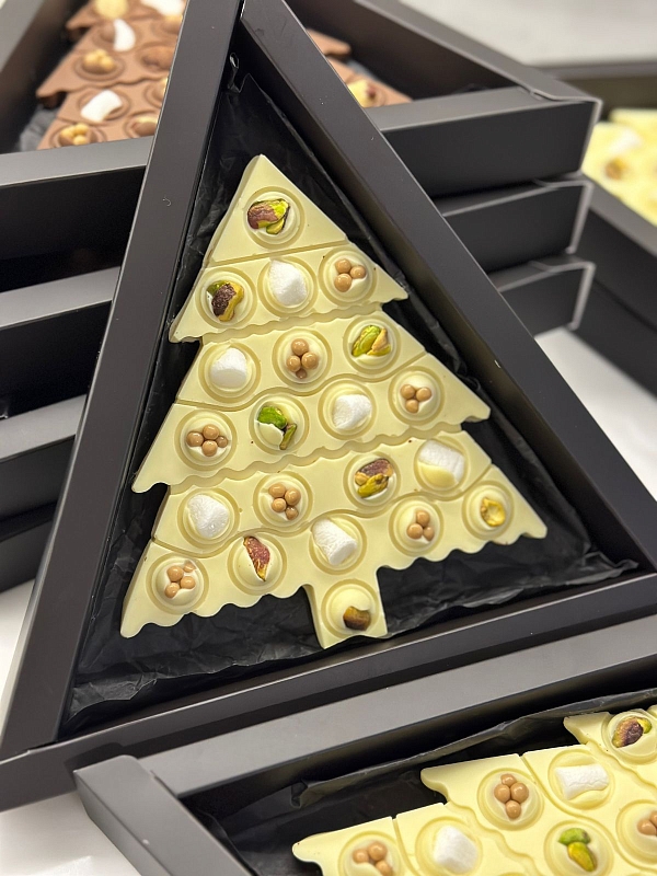 ✨ Шоколадная ёлка из новогодней коллекции — маленькое гастрономическое чудо, созданное, чтобы дарить настроение. Нежный белый бельгийский шоколад 🍫 сочетается с карамельными криспами для лёгкого хруста, фисташкой 💚 для благородной ореховой ноты и мягкими маршмеллоу, которые тают почти мгновенно ☁️.