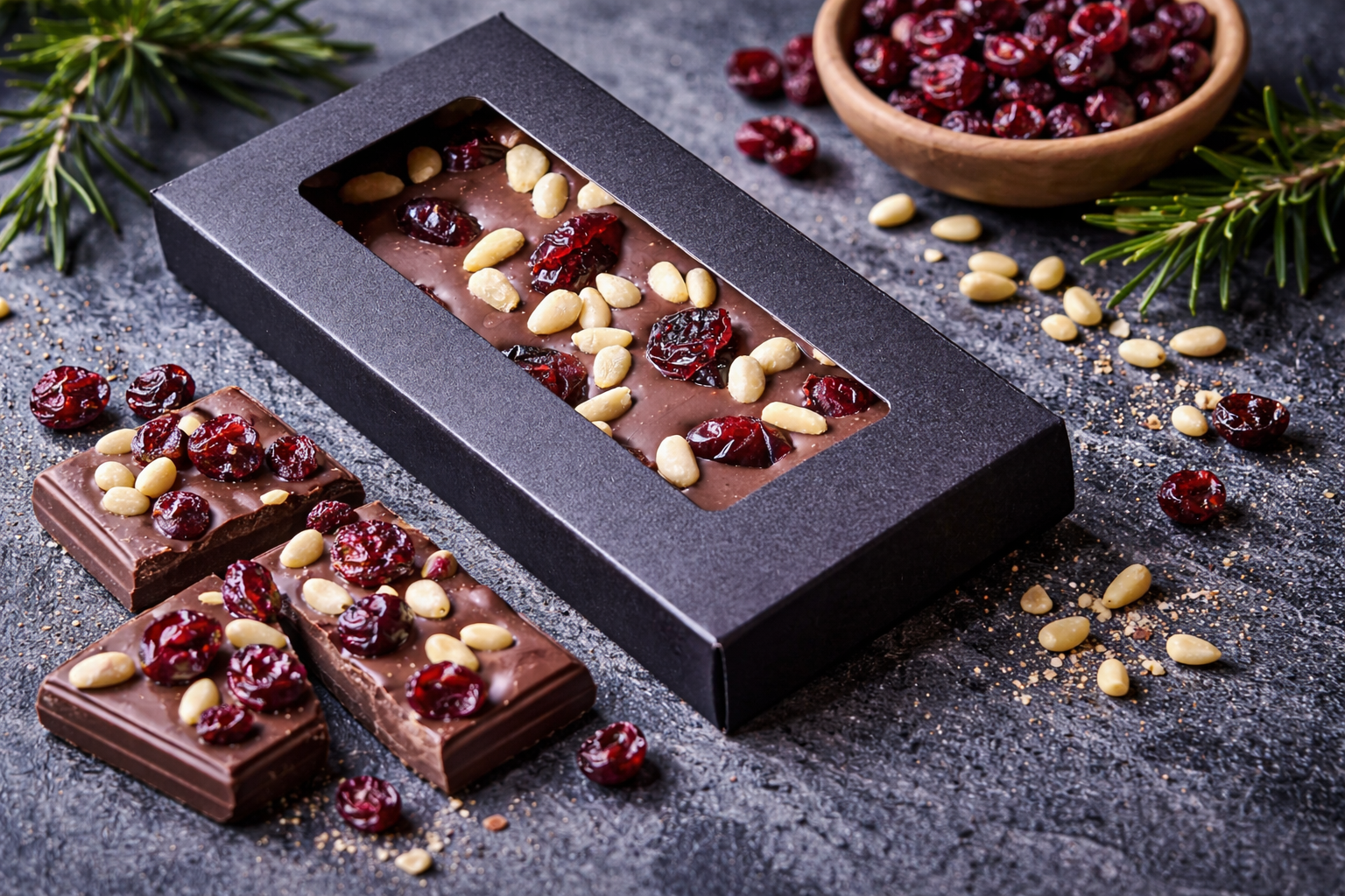 Тёмный шоколад «Кедр–клюква» изготовлен вручную на основе качественного бельгийского шоколада. Вкус насыщенный, глубокий, с лёгкой благородной горчинкой.