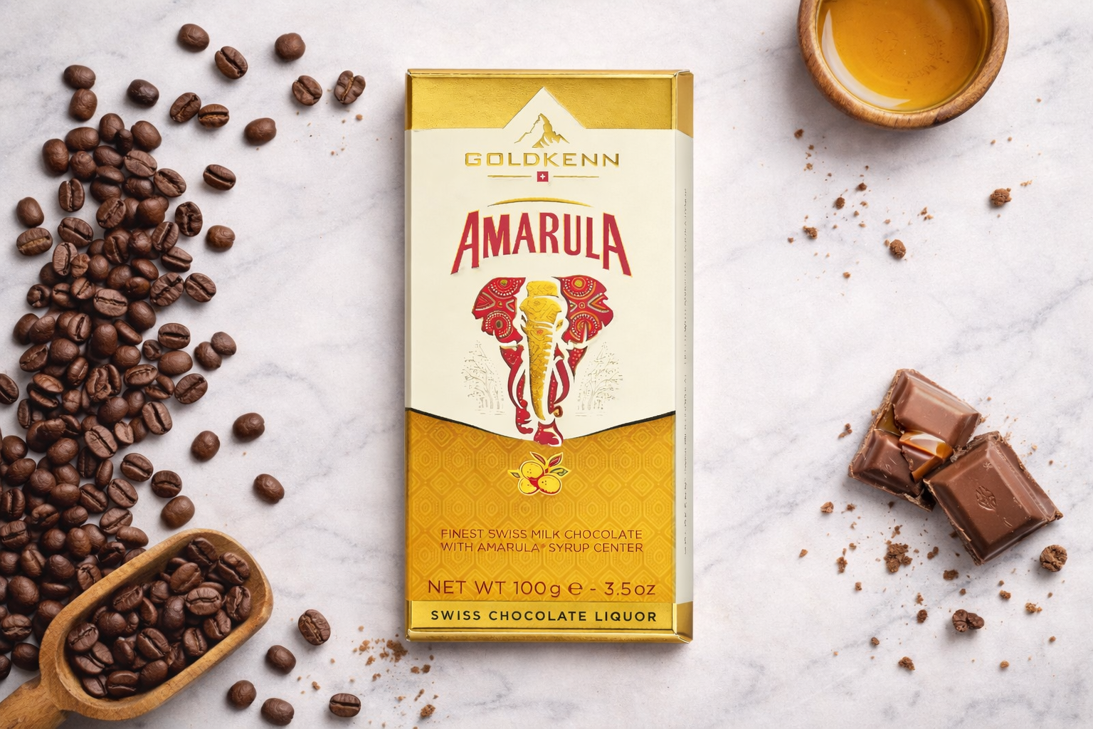 Молочный шоколад с начинкой Амарула Goldkenn — это утончённое сочетание классического швейцарского шоколада и нежного текучего центра с узнаваемым сливочно-карамельным характером 🍫✨