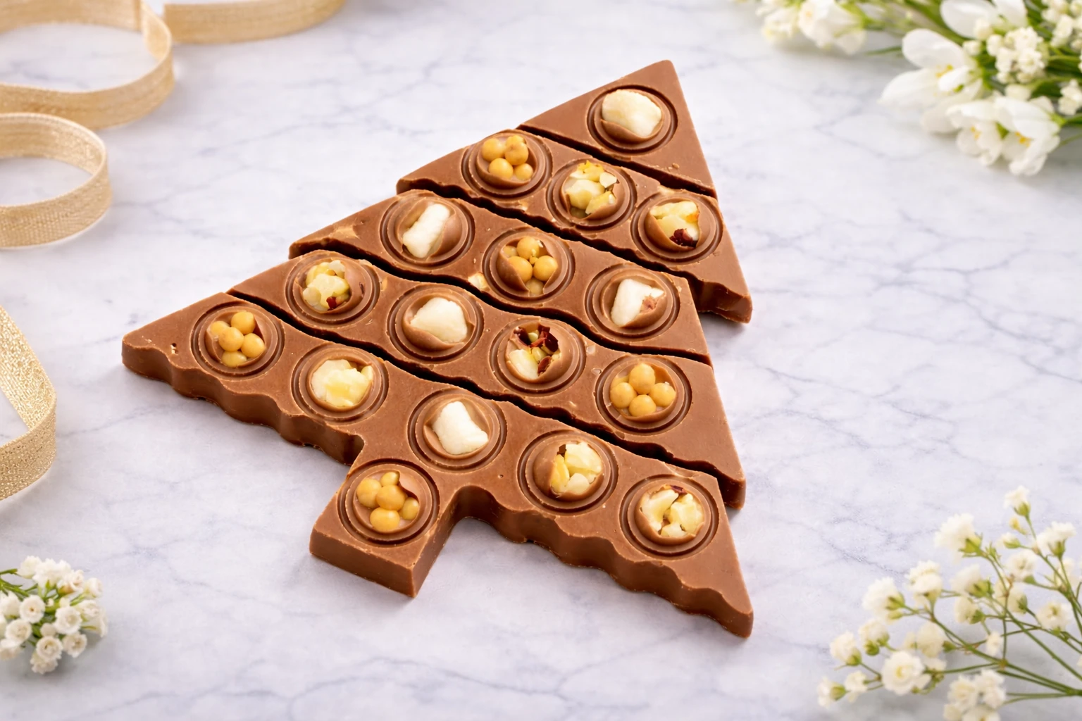 Белый бельгийский шоколад с криспами, фисташкой и маршмеллоу в форме ёлки.