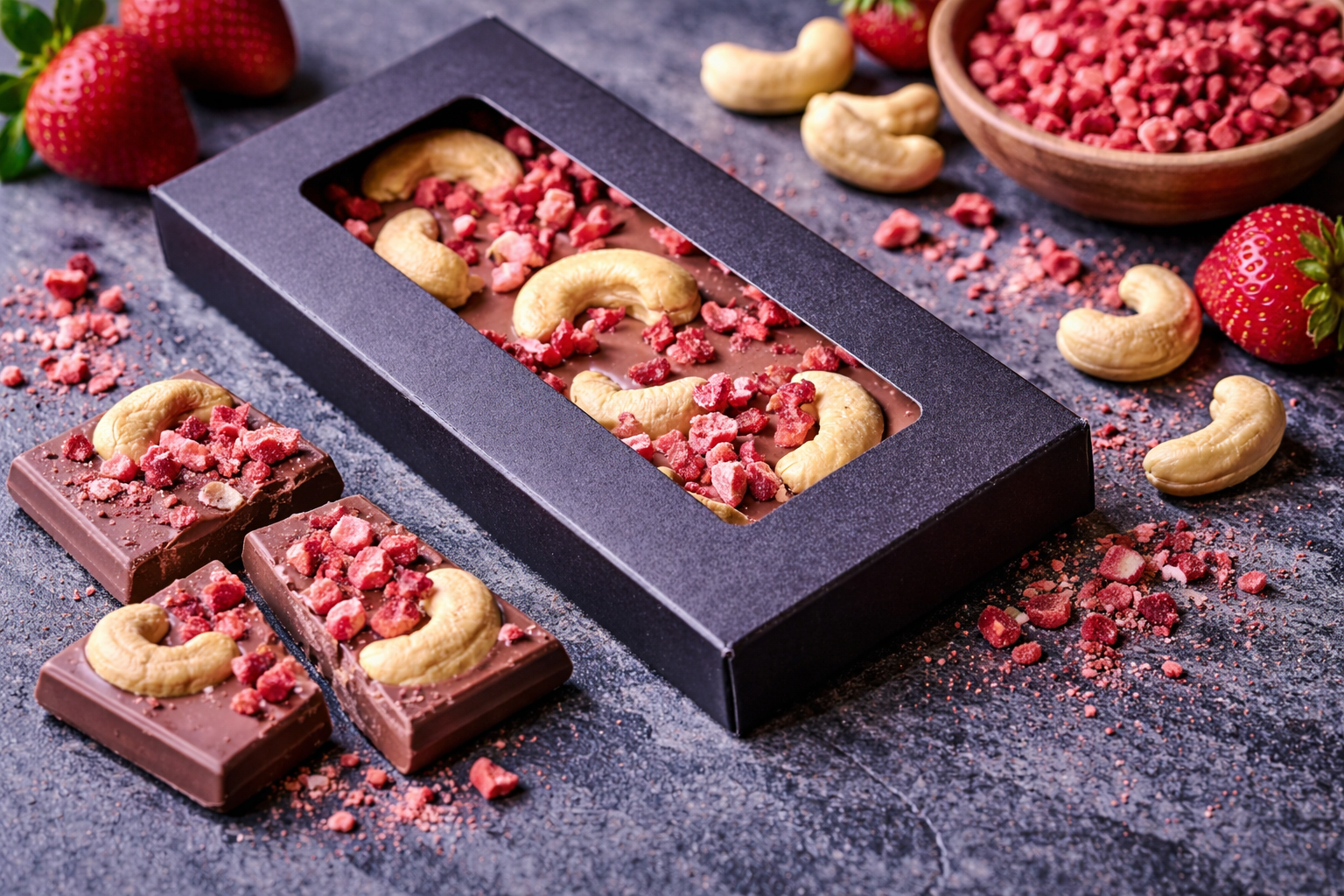 Сублимированная клубника добавляет натуральную ягодную кислинку и яркий аромат, а жареный кешью — нежную ореховую текстуру и тёплое послевкусие.