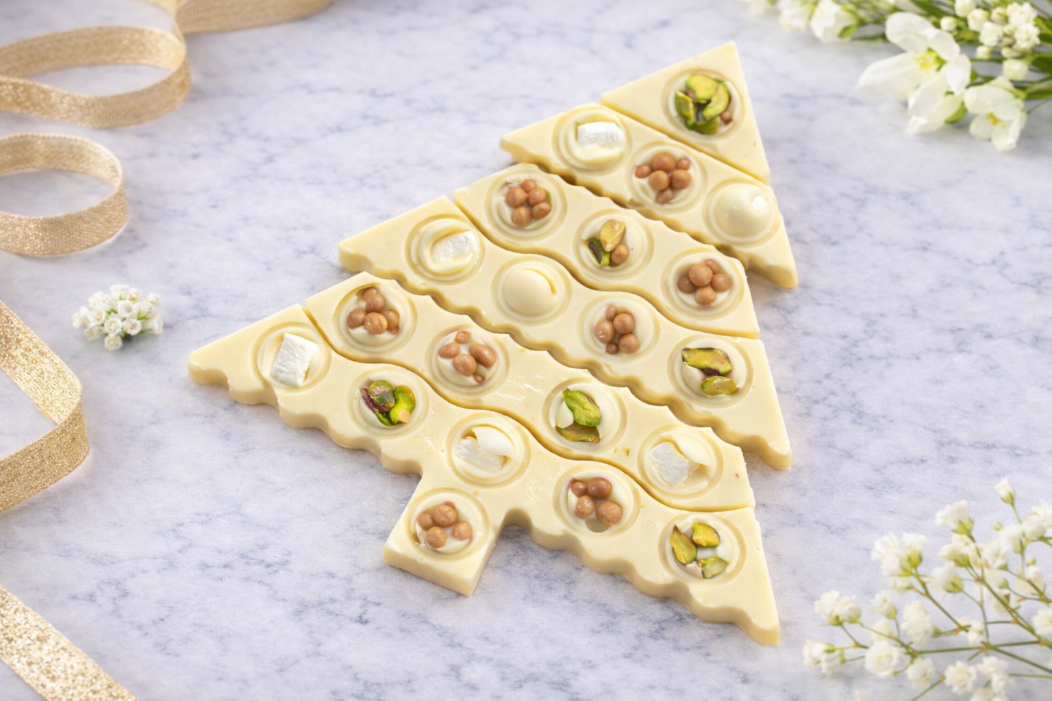 ✨ Шоколадная ёлка из специальной коллекции — маленькое гастрономическое чудо, созданное, чтобы дарить настроение. Нежный белый бельгийский шоколад 🍫 сочетается с карамельными криспами для лёгкого хруста, фисташкой 💚 для благородной ореховой ноты и мягкими маршмеллоу, которые тают почти мгновенно ☁️.