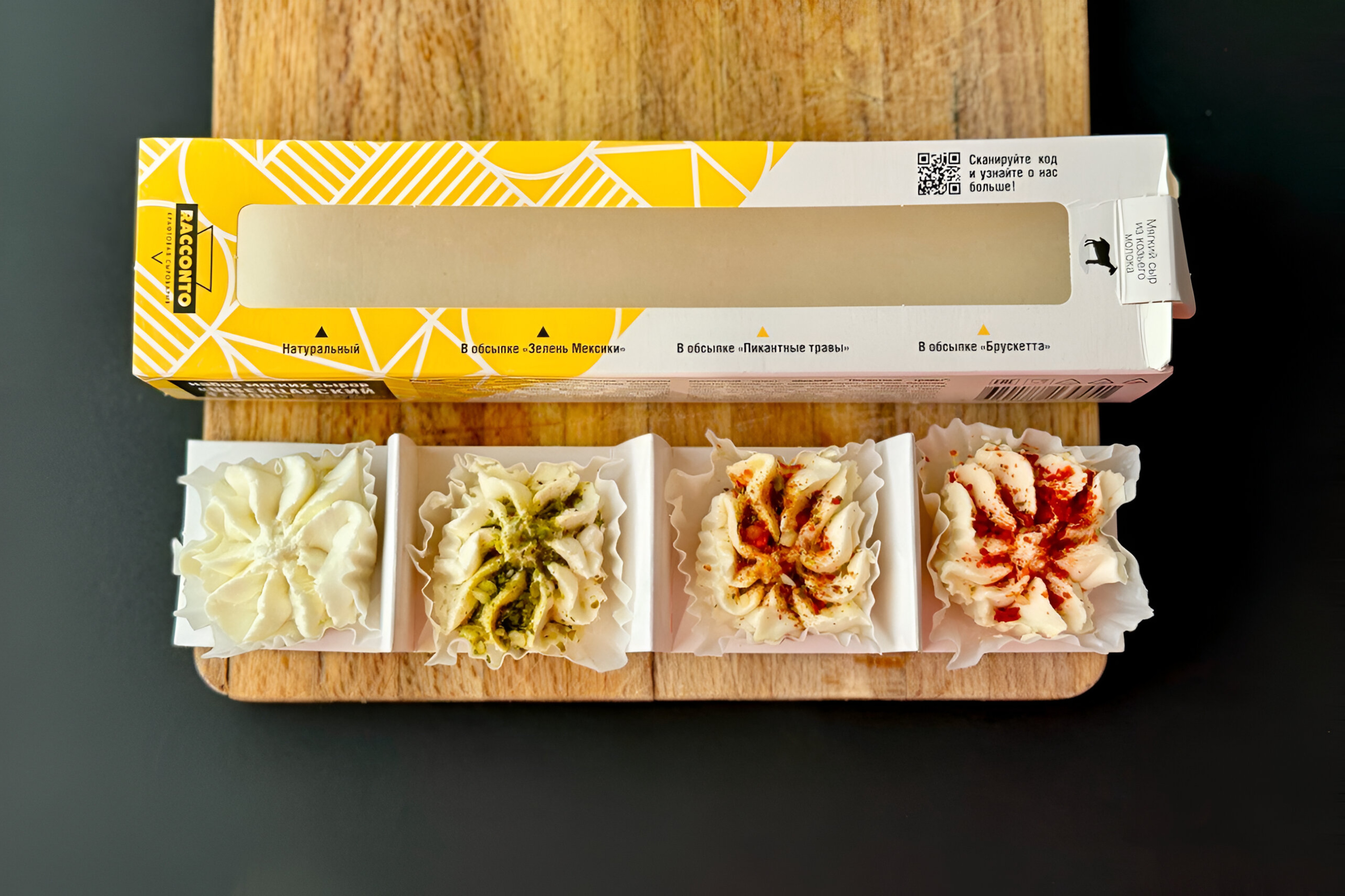 Ассорти мягких сыров из козьего молока в обсыпке из трав - это нежный сливочный творожный крем-сыр из козьего молока, в обсыпке из трех видов трав, который идеально подходит под завтрак с хрустящим утренним багетом. Внешний вид этого сыра вызывает восторг, а воздушная кремовая текстура с посыпкой из пикантных трав, мексиканской зелени и ароматной брускетты создает впечатление кулинарного шедевра.