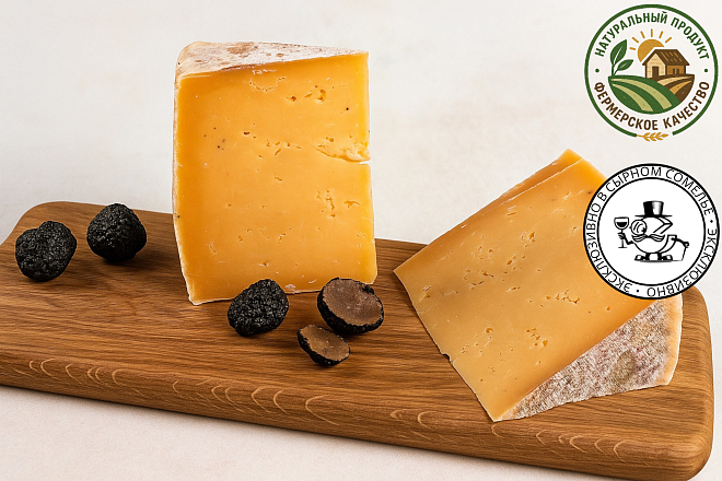 Чеддер с выдержкой от 6 месяцев нежный и маслянистый с ярко-сливочным вкусом. Ароматный и яркий, с деликатным землистым мускусным вкусом черного трюфеля, присутствует маслянистая текстура,чувствуется ароматика трав и цветов.