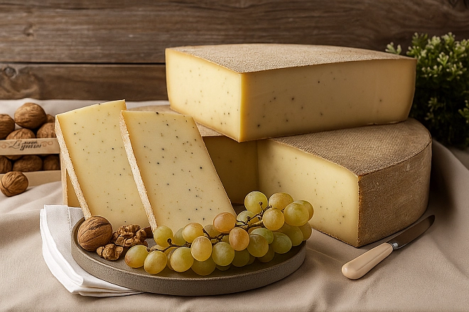 Полутвердый сыр из коровьего молока с кусочками натурального черного трюфеля.