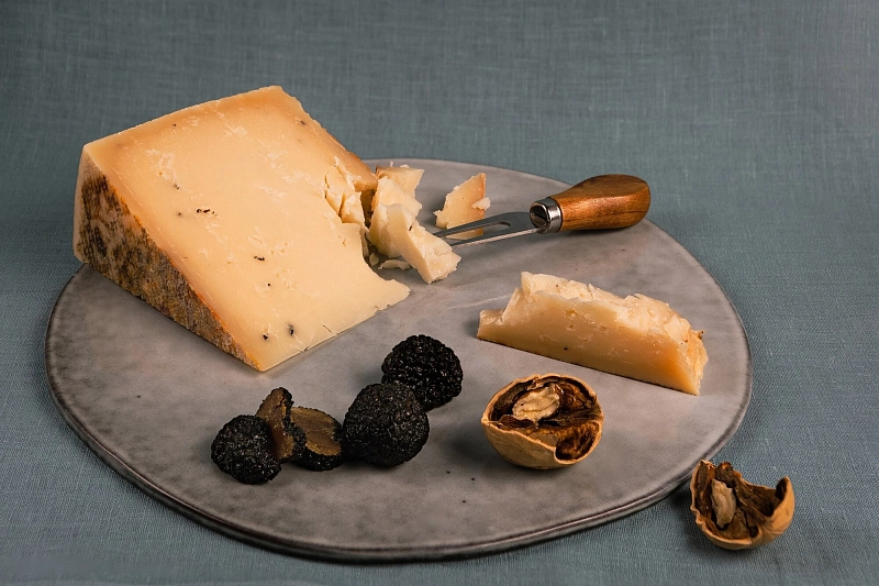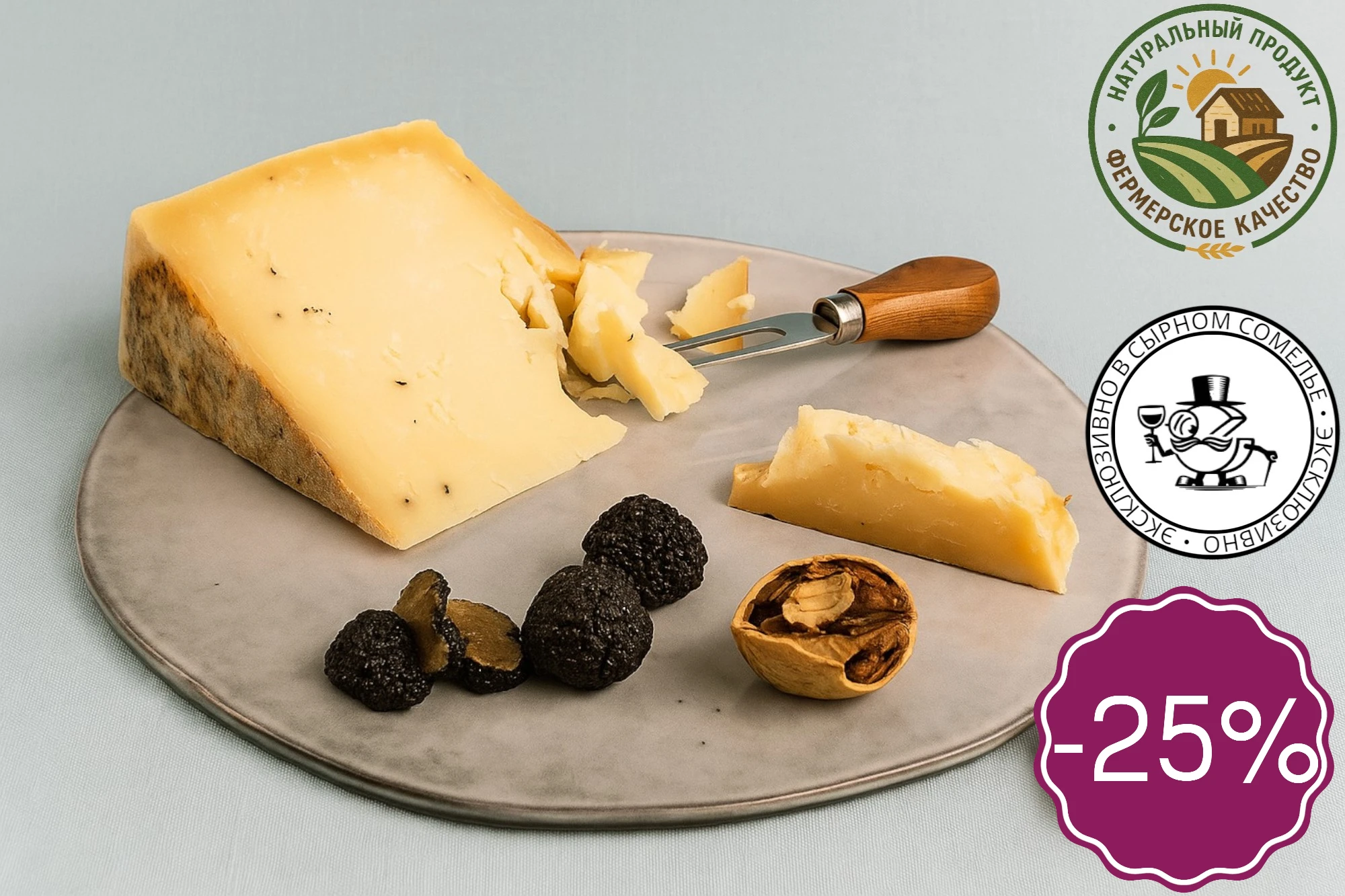 Козье молоко придаёт сыру мягкую пикантность и лёгкую природную сладость, а трюфель добавляет утончённую земную ноту, делая вкус глубже и благороднее 🍄