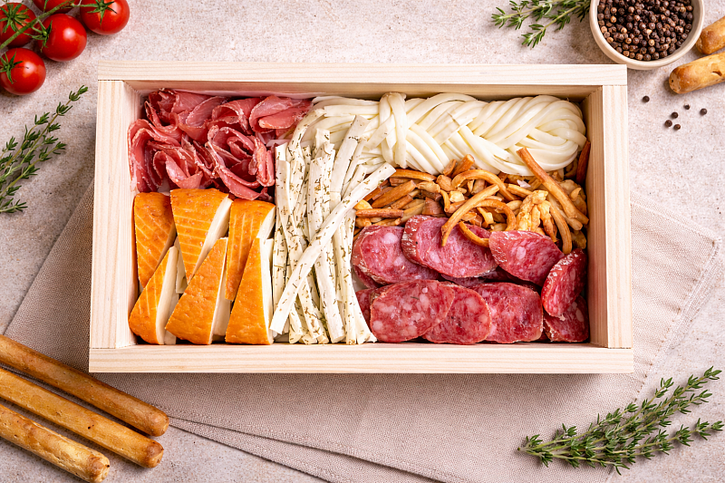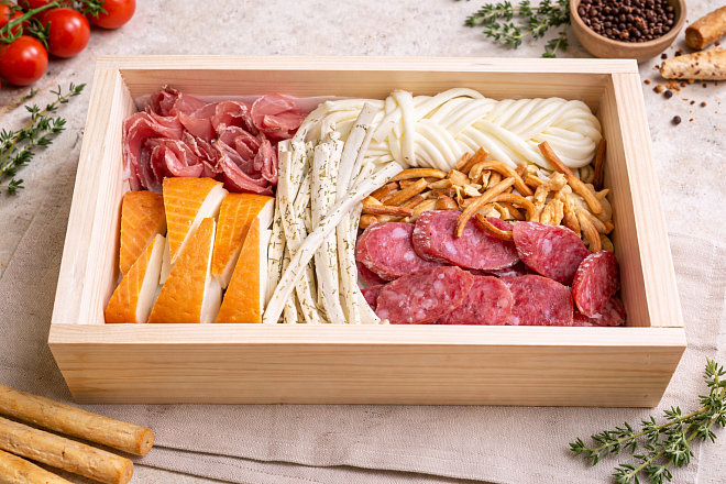 «Пивной дуэт» — это гармония копчёных и сливочных сыров в компании ароматных колбас и деликатесов. Здесь есть и плотные текстуры, и мягкие, тянущиеся сыры, и яркие мясные акценты — всё, чтобы каждый кусочек был разным и интересным.