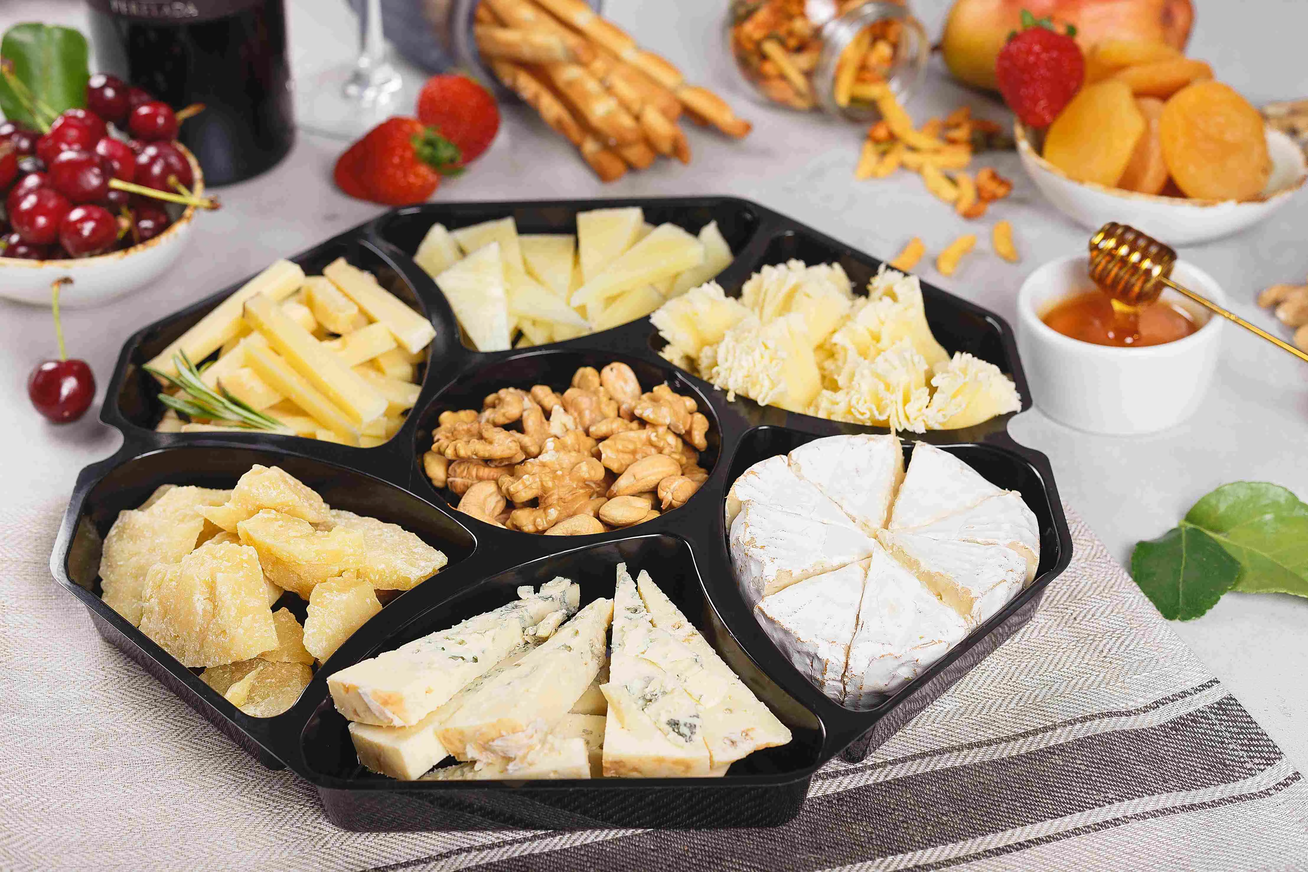 Сыры укладываются в менажницы с глубокими отсеками, которые не позволяют продукции перемешаться между собой.