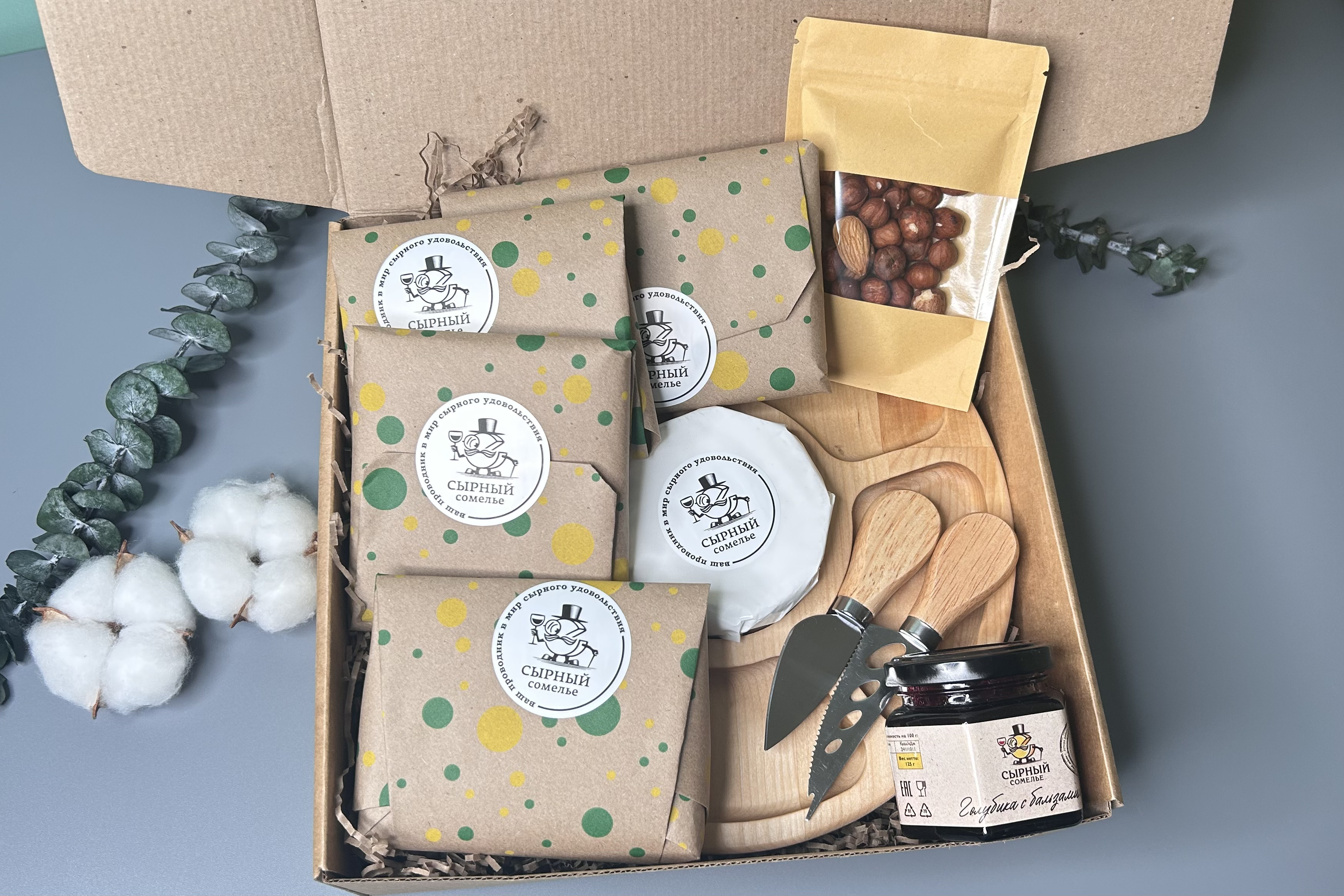 Подарочный набор из 8 сыров и фруктового джема, упакованный в крафтовую коробку.