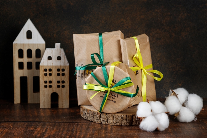 Подарочный гастрономический набор, упакованный в крафтовую коробку.