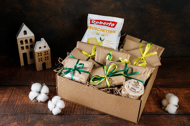 Подарочный гастрономический набор, упакованный в крафтовую коробку.
