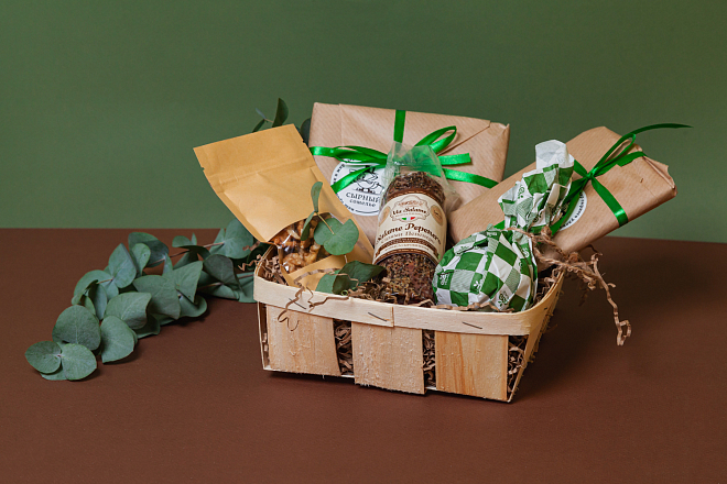 Подарочный гастрономический набор, упакованный в крафтовую коробку.