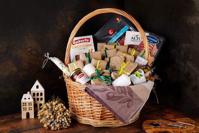 Подарочный ящик: семь видов сыров, соус, оливковое масло, мясные деликатесы, оливки, томат... еще