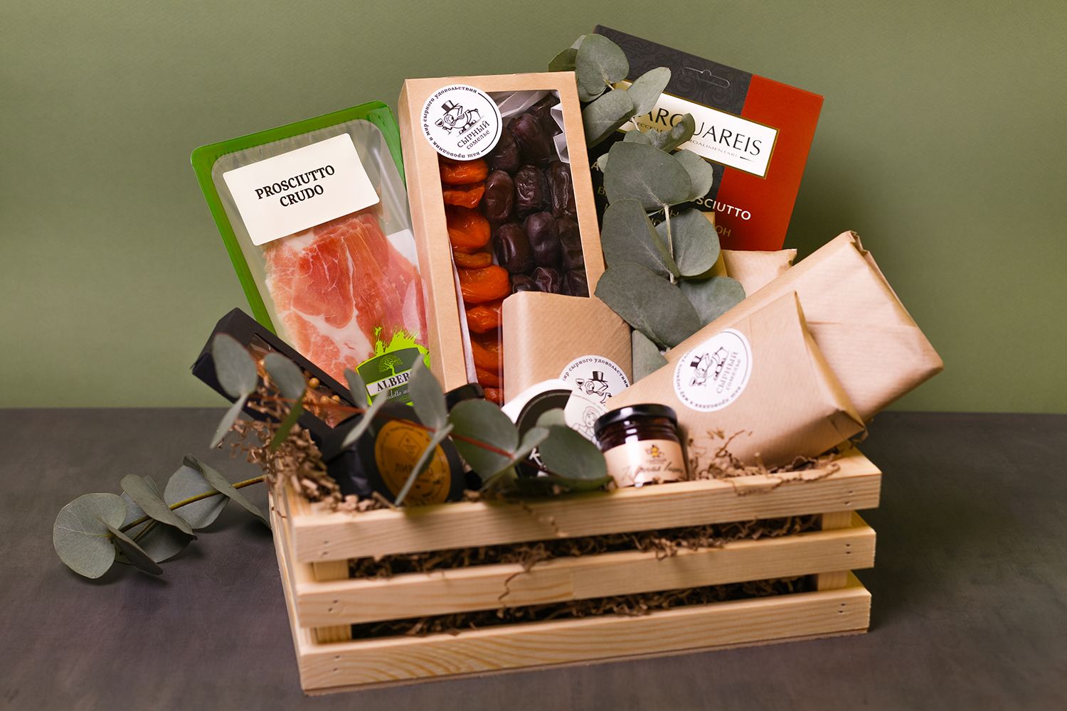 Внутри — 7 авторских и классических сыров, два вида дополнений и заботливо подобранные сладости и деликатесы.