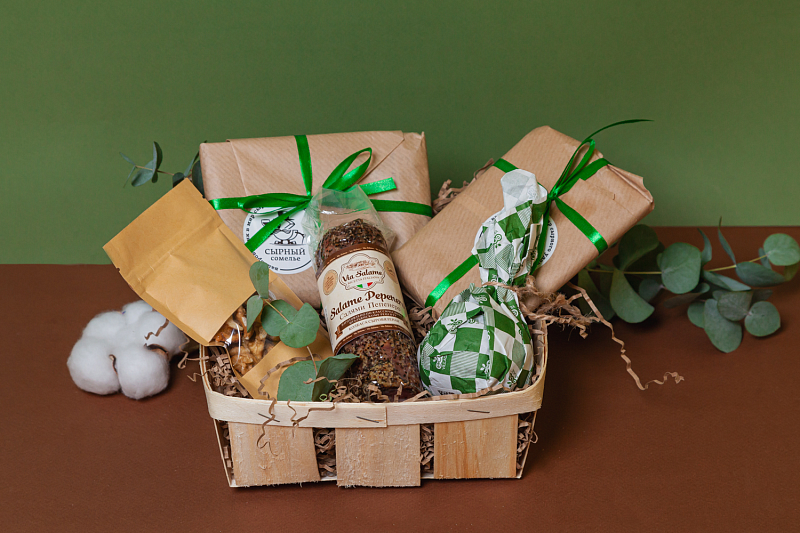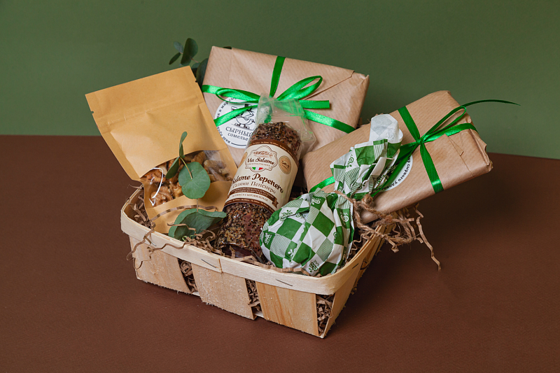 Набор приезжает в уютной плетёной шпонке, аккуратно упакованной в прозрачную плёнку — полностью готовый к вручению.