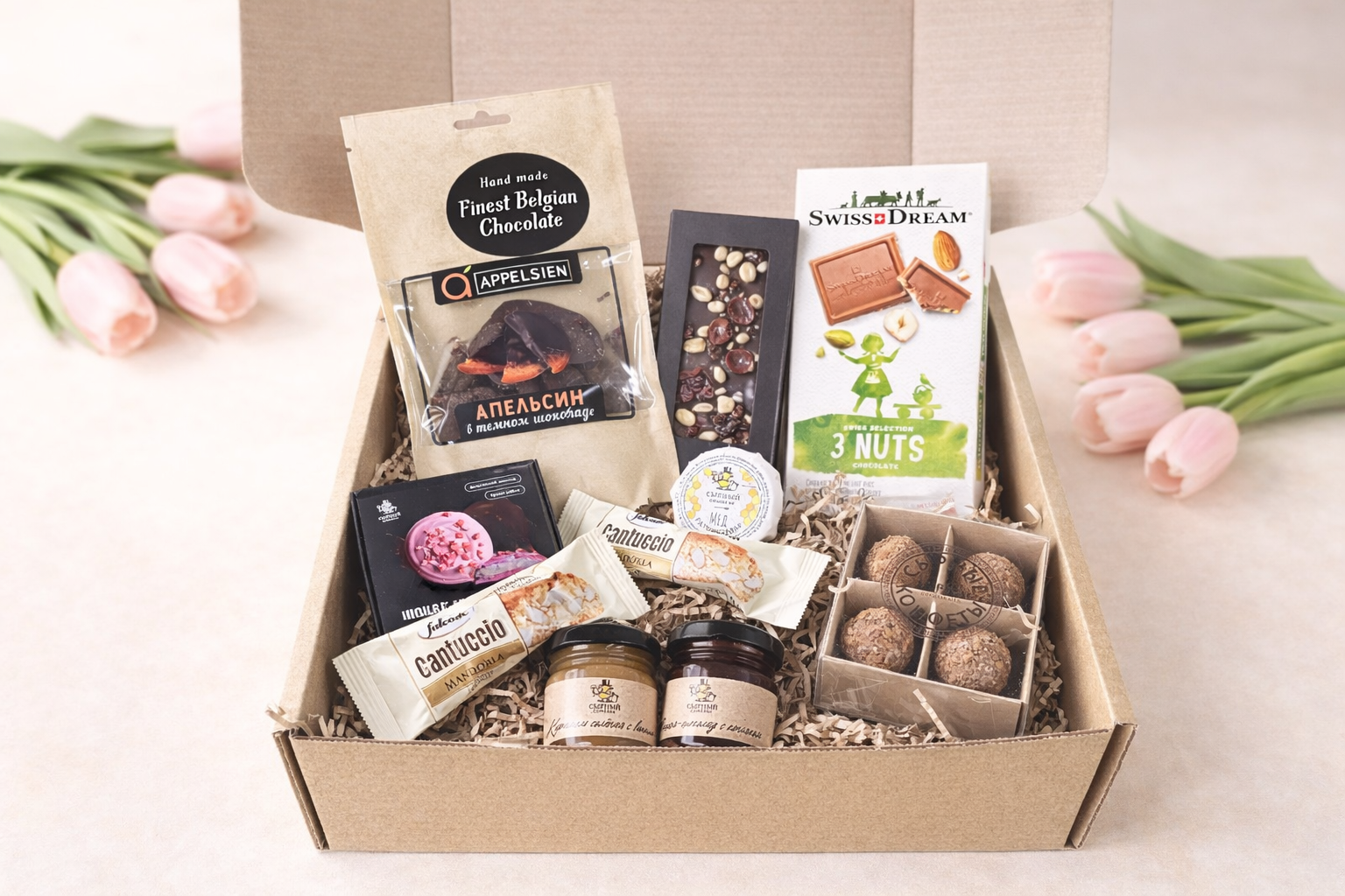 Универсальный сладкий подарок с богатым наполнением и разнообразием вкусов. Он идеально подойдёт для тех, кто любит сочетание шоколада, фруктовой сладости и необычных гастрономических акцентов.