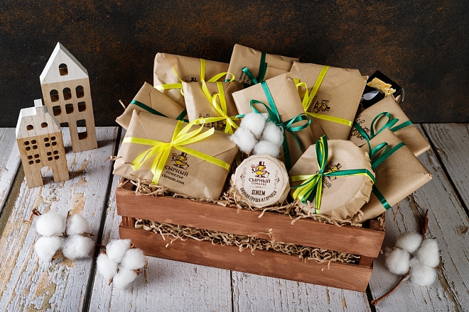 Подарочный ящик: семь видов сыров, соус, оливковое масло, мясные деликатесы, оливки, томат... еще