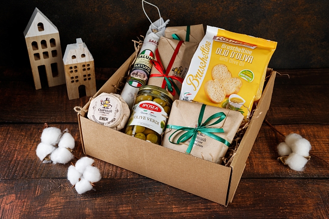 Подарочный ящик: семь видов сыров, соус, оливковое масло, мясные деликатесы, оливки, томат... еще