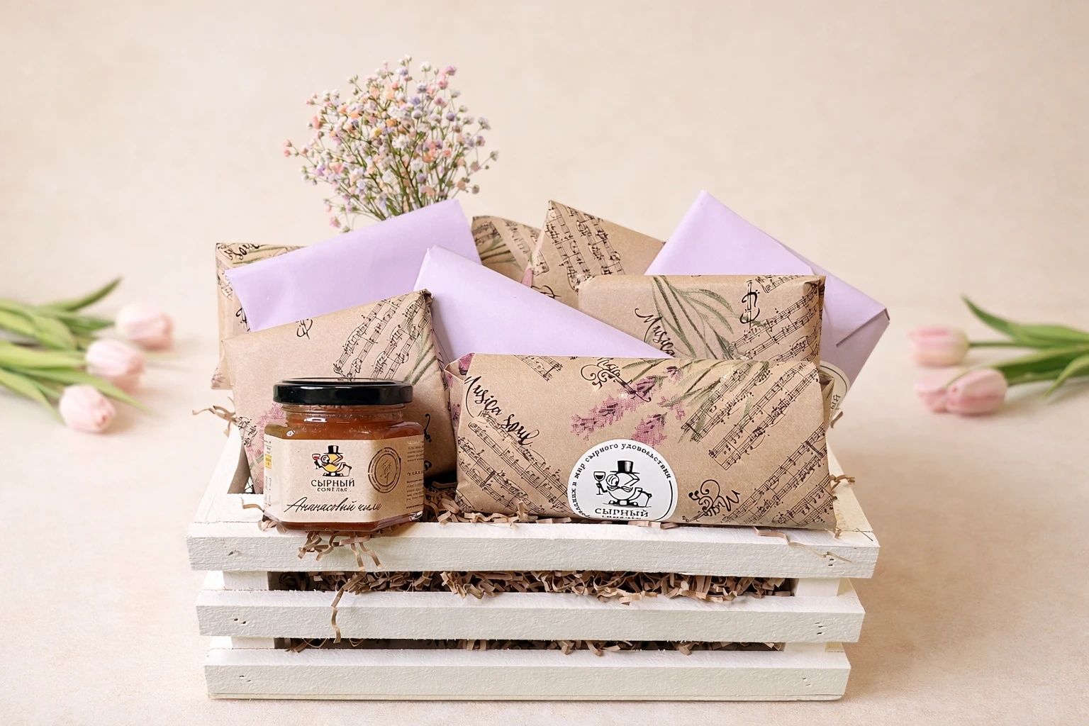 Внутри — большой набор сыров разных стилей, текстур и характеров. Такой подарок станет ярким комплиментом к любому празднику, удивит гурманов, порадует близких и идеально подойдёт для праздничной дегустации.