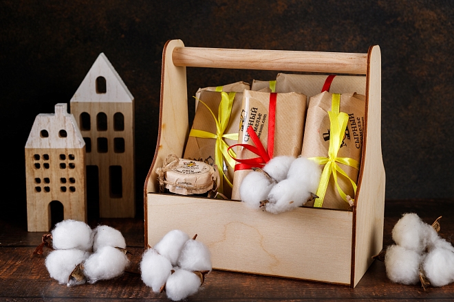 Подарочный гастрономический набор, упакованный в крафтовую коробку.