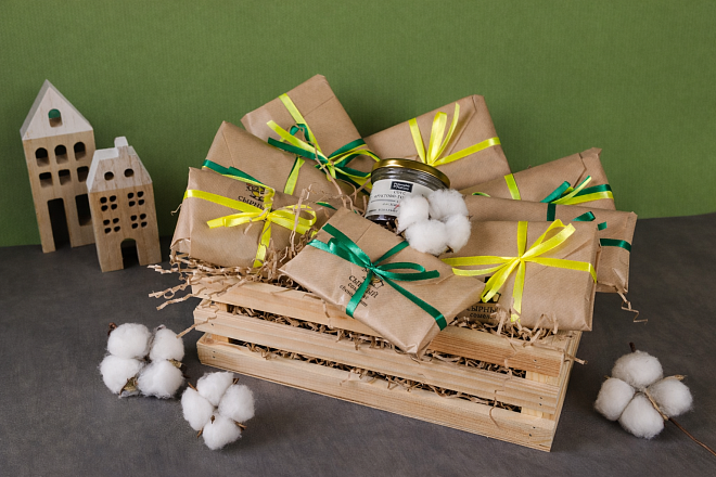 Набор приедет в стильном деревянном ящике, аккуратно упакованном в прозрачную плёнку.