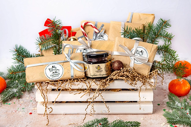 Внутри — большой набор сыров разных стилей, текстур и характеров. Такой подарок станет ярким комплиментом к Новому году, удивит гурманов, порадует близких и идеально подойдёт для праздничной дегустации.